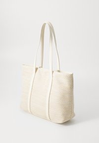 Sac cabas beige tissé avec des anses en cuir crème et une petite étiquette de marque rectangulaire à l'avant, présenté sur un fond blanc.