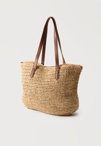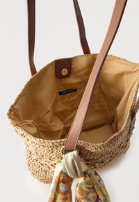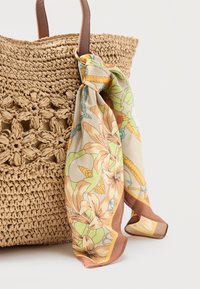 Sac cabas en paille tissée avec des poignées en cuir marron et un foulard en soie fleurie multicolore noué à une poignée.