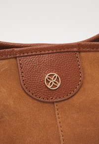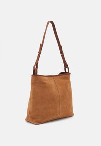 Sac fourre-tout en daim marron avec une texture lisse, doté d'une bandoulière en cuir marron et d'un détail logo circulaire près du haut. Design simple et sans ornements.