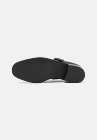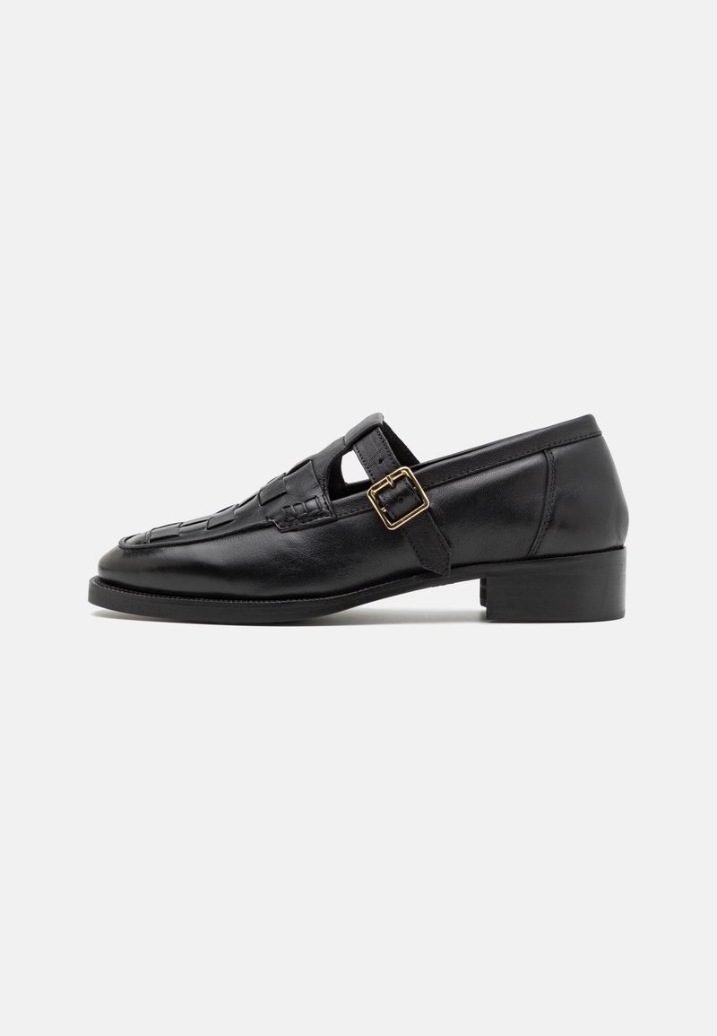 Mocassins en cuir noir à semelles épaisses et plateforme, avec détail en métal argenté, portés pieds nus sur fond blanc.