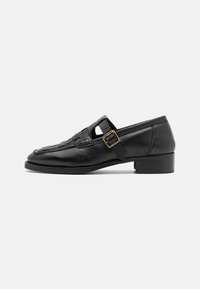 Chaussure en cuir noir avec bride en T et boucle argentée. Dispose d'une semelle texturée et d'un bout arrondi. Design simple avec des accents cousus.