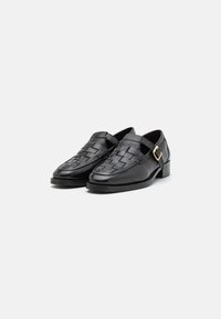 Sandales en cuir noir avec des brides croisées et un talon carré. Présente une boucle dorée et une semelle texturée pour une meilleure adhérence.