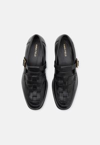 Mocassins noirs avec une tige en mesh texturé, des accents en cuir, et une semelle en caoutchouc contrastante au design épais avec un détail en gland.