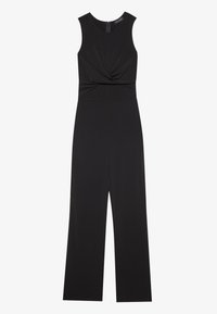 Combinaison noire sans manches avec un col en V profond, des accents cloutés sur les épaules, une taille marquée et un pantalon à jambes larges. Comprend des poches latérales.