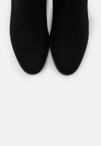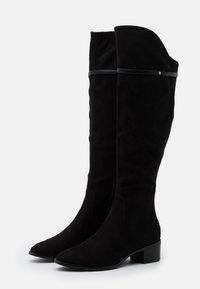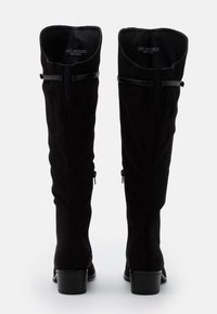 Bottes mi-cuisses en daim noir avec un bout arrondi, un petit talon bloc et une sangle décorative avec un accent métallique en haut.
