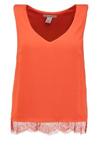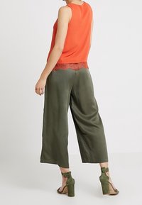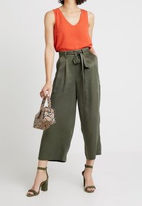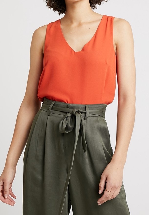 Haut sans manches orange vif avec un col en V, associé à un pantalon taille haute vert olive avec une ceinture à nouer et une texture de tissu lisse.