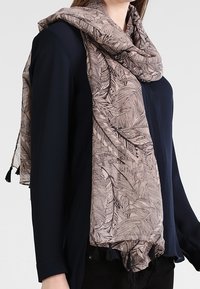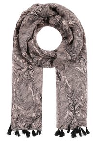 Femme portant une écharpe mauve clair avec un motif détaillé de plumes sur un chemisier à manches longues foncé, les extrémités de l'écharpe pendent avec des franges.