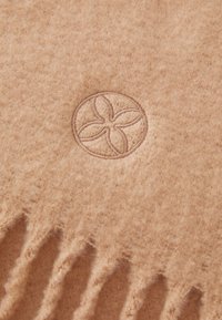 Écharpe beige avec une texture subtile et des bords frangés, présentée sur un fond blanc uni. Le logo apparaît près du bord inférieur.