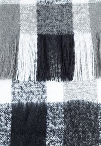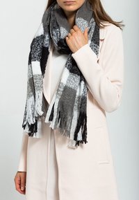 Femme portant un manteau beige clair et tenant autour du cou une grande écharpe à franges à carreaux noirs, blancs et gris.