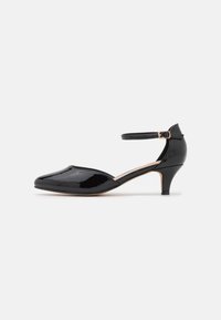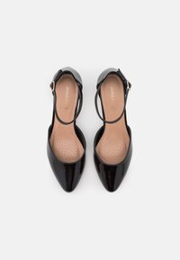 Chaussure à talon haut en cuir verni noir avec bout pointu, bride de cheville et talon fin. Texture lisse et design simple avec des accents minimaux.