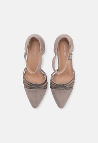 Chaussure à talons hauts à bout pointu en daim gris doux, avec une sangle de cheville et plusieurs détails de sangle striée grise à l'avant.