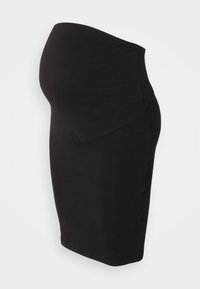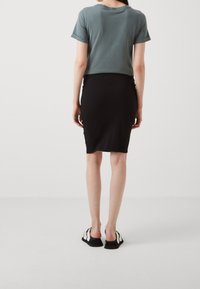 Personne enceinte portant un haut vert, une jupe noire longueur genou et des sandales blanches ouvertes, debout devant un fond uni.