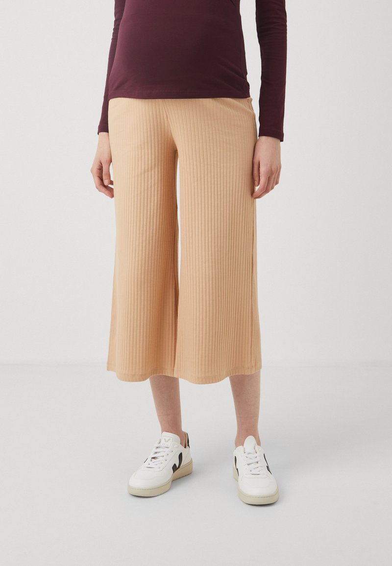 Culottes beige côtelées à coupe large, associées à des baskets blanches avec des accents noirs, sur un fond neutre.