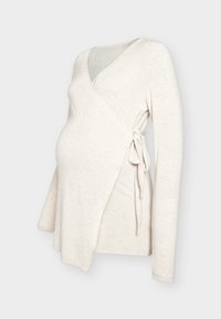 Haut de maternité beige à manches longues avec nouage latéral, conçu pour s’adapter à un ventre qui s’arrondit, présenté sur un fond neutre.