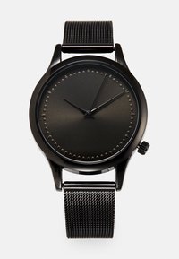 Montre analogique noire avec cadran minimaliste, sans chiffres, uniquement des petits points et des marqueurs triangulaires, et un bracelet en métal maille affichant l'heure 10:09:04.
