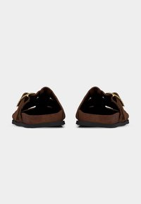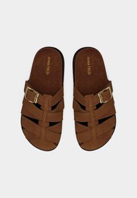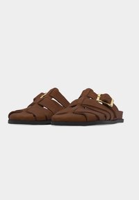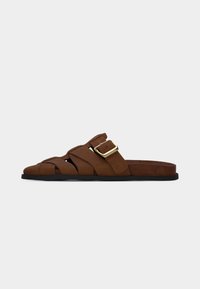 Sandale en cuir marron avec boucle dorée et semelle noire, flottant au-dessus d'un sol en béton lisse, avec en arrière-plan un glass rayé verticalement.