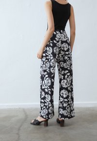 Pantalon large à fleurs en noir et blanc avec un tissu lisse, doté d'une taille haute et d'un motif floral audacieux. Chaussures noires à enfiler.