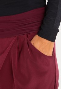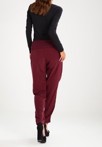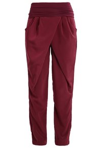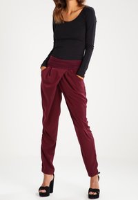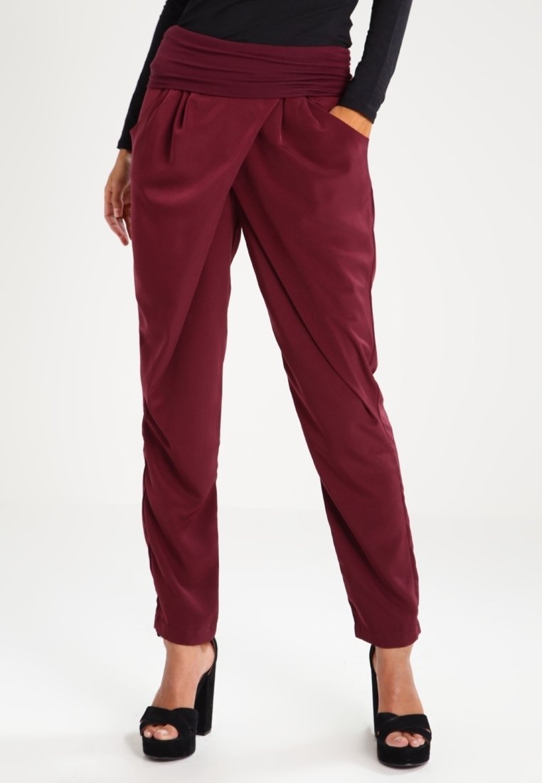 Pantalon bordeaux à taille haute, texture douce, plis sur le devant, et deux poches latérales, associé à des talons compensés noirs.