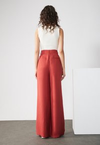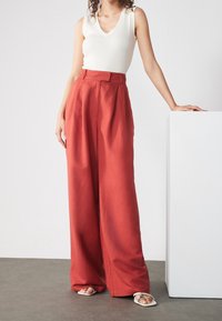 Pantalons larges dans une riche couleur terre cuite, confectionnés dans un tissu lisse. Présentent une taille haute, des poches latérales et un ajustement soigné.