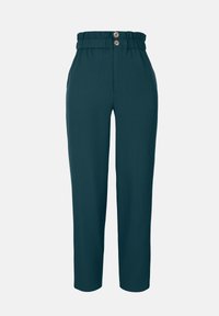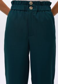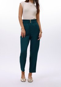 Femme portant un pantalon taille haute teal avec des boutons et des poches, associé à un haut sans manches beige et des chaussures plates métalliques dorées.