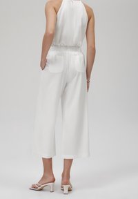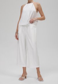 Pantalon blanc à jambes larges avec taille élastique, poches latérales et tissu lisse et léger ; associé à des sandales à talons ouvertes.