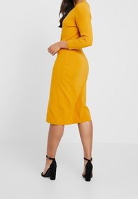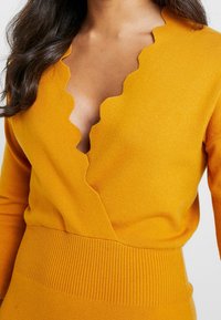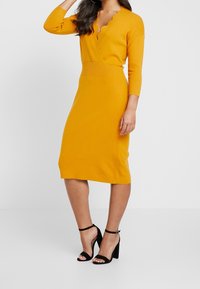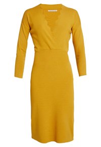 Robe en maille jaune moutarde avec un décolleté en V festonné, des manches trois-quarts, et une taille côtelée, associée à des sandales noires à talons blocs et lanières.