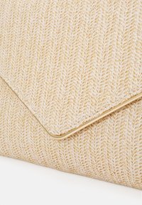 Pochette enveloppe beige tissée avec une bandoulière chaîne dorée et un détail pompon assorti sur fond uni.