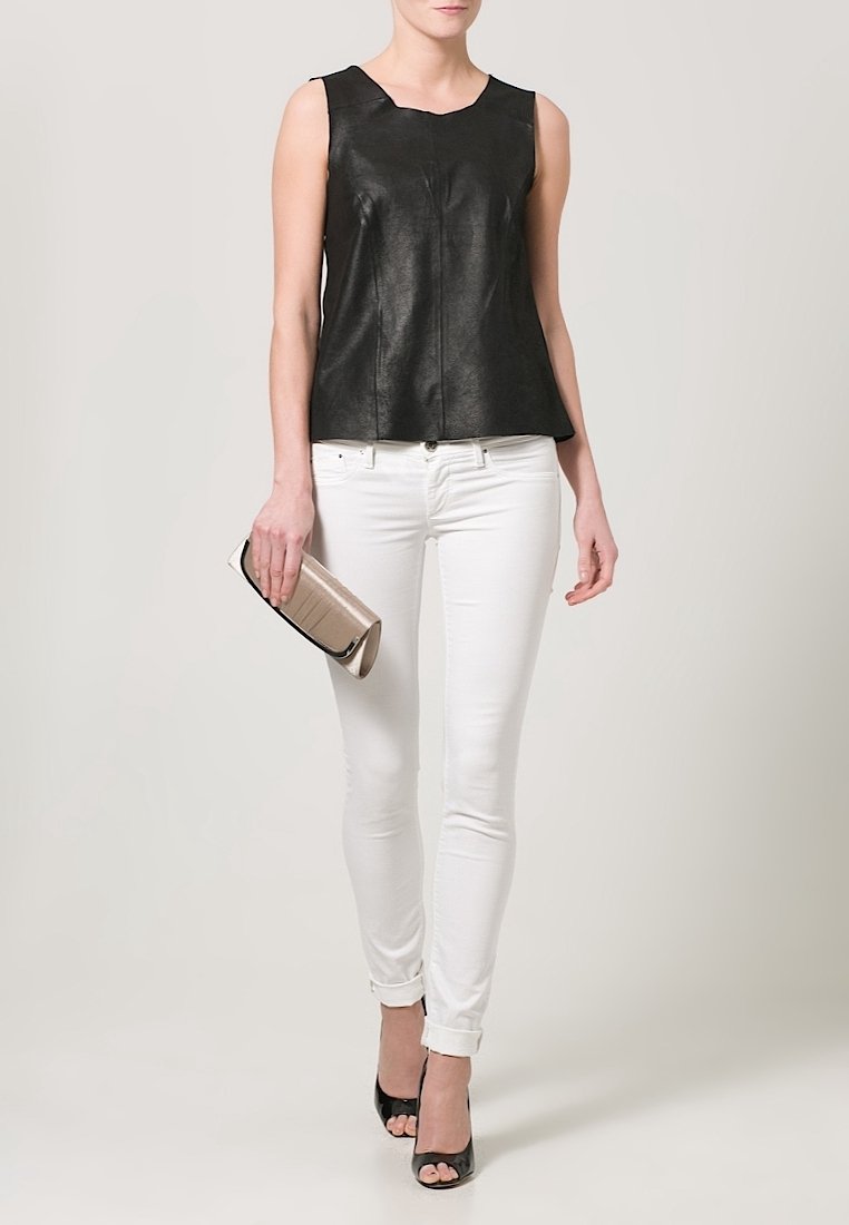 Femme portant un haut sans manches en cuir noir, un jean skinny blanc, des talons ouverts noirs, tenant une pochette beige.