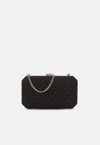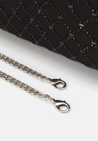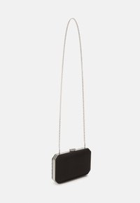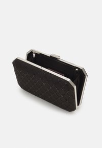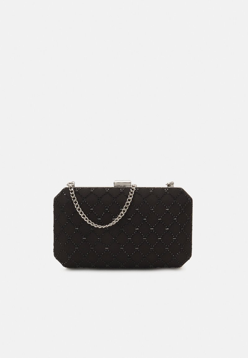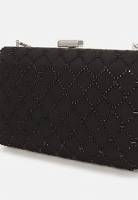 Pochette rectangulaire noire avec motif matelassé et chaîne argentée, équipée d'une fermeture à clapet argentée sur le dessus.