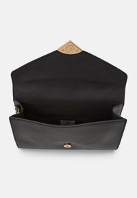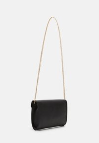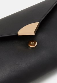 Pochette enveloppe en cuir noir avec fermeture triangulaire dorée et fine chaîne dorée sur fond clair uni.