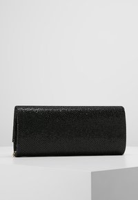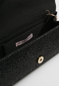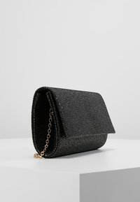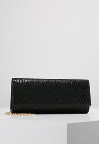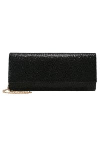 Pochette noire texturée avec rabat et chaîne dorée, présentée sur une surface blanche devant un fond gris.
