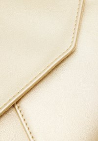 Pochette enveloppe dorée avec un pompon et une fine chaîne dorée, présentée sur un fond blanc uni.