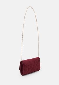 Petite pochette en daim bordeaux avec une chaîne dorée en bandoulière et le logo "Anna Field" embossé sur le rabat avant.
