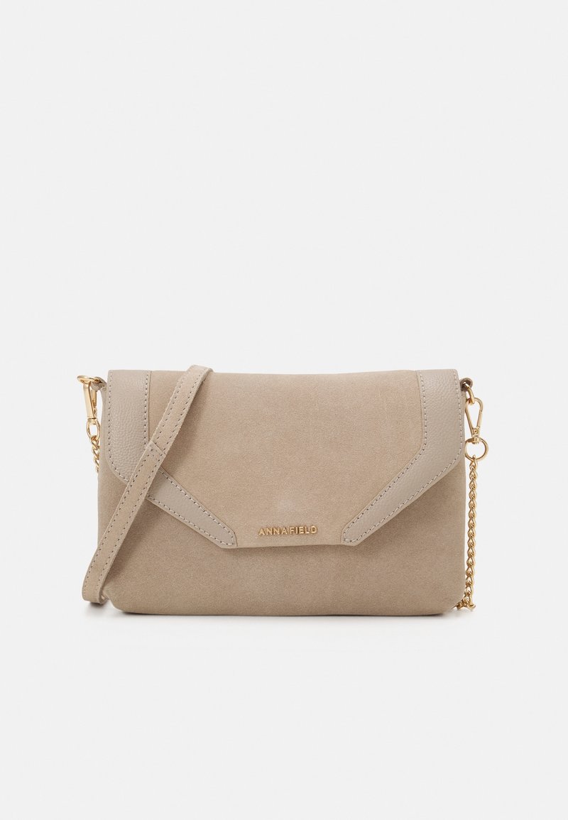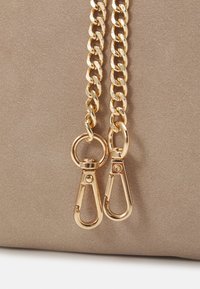 Sac bandoulière en daim beige avec fermeture à rabat, chaîne dorée et sangle en cuir, et logo de marque doré discret sur le devant.