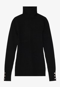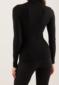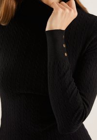 Femme portant un pull noir moulant à col roulé en maille torsadée avec des boutons dorés sur les poignets et un pantalon noir, sur un fond uni.