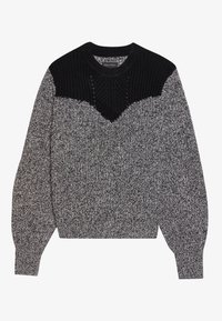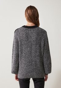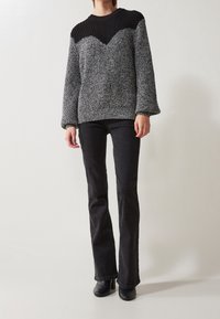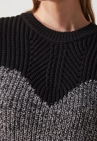Personne portant un pull en maille noir et blanc chiné avec une empiècement côtelé noir uni et un pantalon foncé, debout devant un fond uni.