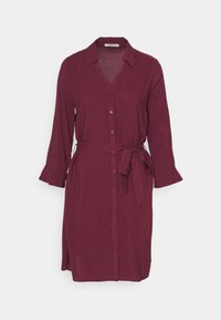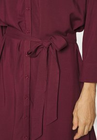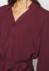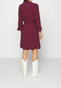 Robe boutonnée bordeaux avec une ceinture à nouer, manches évasées et décolleté en V, associée à des bottes de cowboy blanches avec des coutures décoratives.