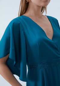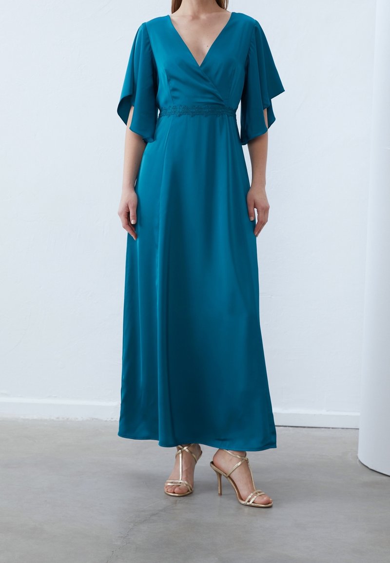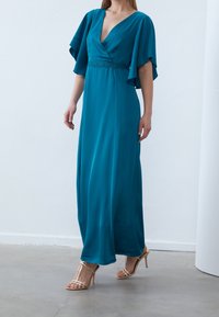 Femme portant une robe enveloppante teal avec des manches flottantes et un détail en dentelle à la taille, assortie de sandales à talons hauts dorées à lanières sur un sol gris.