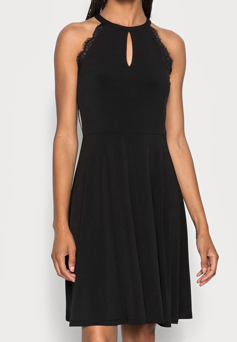 Robe noire sans manches avec un décolleté en forme de goutte, détails en dentelle sur les épaules, corsage ajusté et jupe évasée. Texture de tissu lisse.