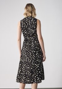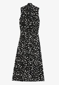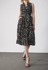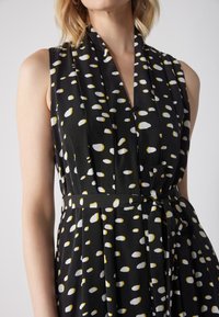 Robe noire avec un col en V, sans manches, dotée d'une ceinture à nouer et d'un motif à pois blancs et jaunes sur un tissu fluide.