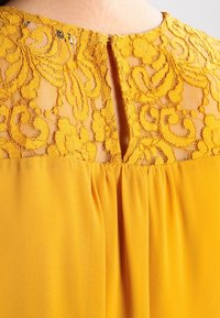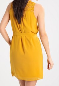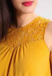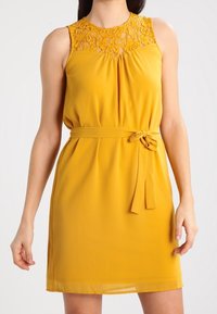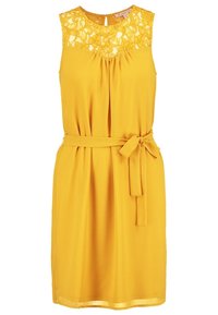 Une robe jaune sans manches avec un corsage en dentelle, un encolure froncée et une ceinture à nouer assortie à la taille. Texture lisse, longueur jusqu'aux genoux.