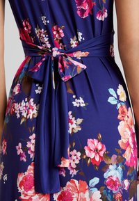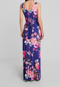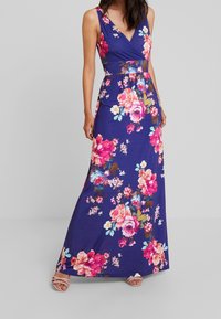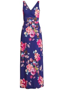 Robe maxi en bleu marine avec un motif floral. Dotée d'un décolleté en V, d'un design sans manches et d'une taille cintrée. Fabriquée en tissu extensible et lisse.