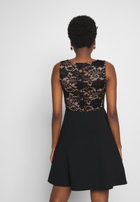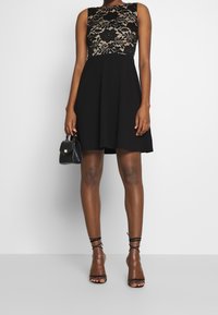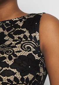 Robe noire avec un corsage en dentelle ajusté orné de motifs floraux et une jupe évasée. Conception sans manches avec un col rond.