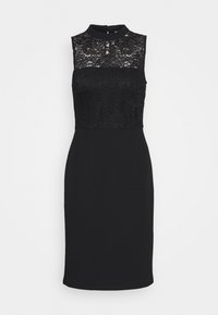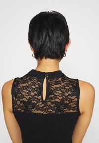 Robe noire sans manches avec un col haut et un motif floral en dentelle couvrant la partie supérieure de la poitrine et les épaules.
