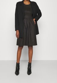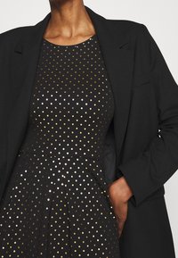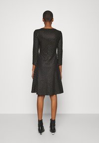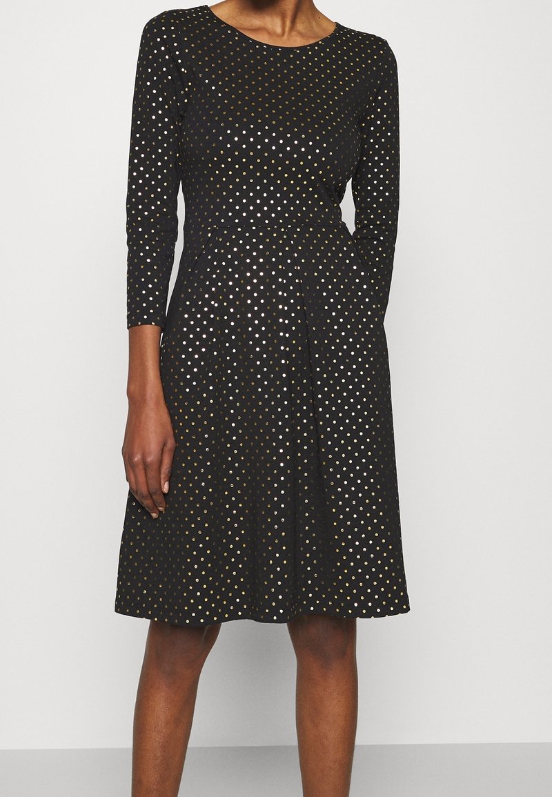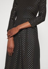 Robe noire à manches longues avec un col rond, ornée de pois dorés et argentés, et un design de jupe évasée.