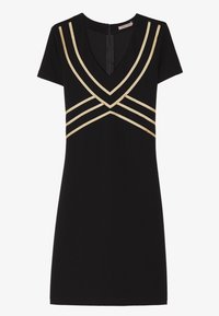 Robe noire ajustée à manches courtes, avec des rayures dorées diagonales sur la poitrine et un décolleté en V. Texture de tissu lisse.