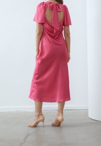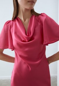 Robe en satin rose vif avec un col drapé et des manches courtes bouffantes, présentant une silhouette ajustée qui descend jusqu'au milieu du mollet.