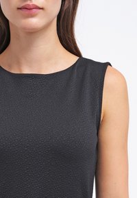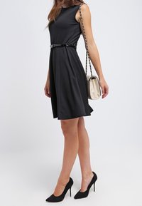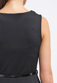 Robe noire sans manches avec une taille cintrée et une jupe fluide. Tissu texturé et ceinture noire brillante mettent en valeur le design.