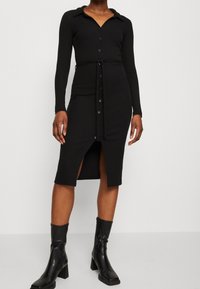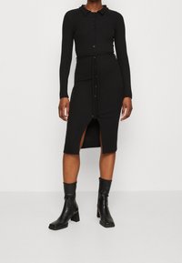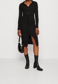 Robe midi noire côtelée avec manches longues, boutonnée à l'avant, col et taille à cordon. Assortie à des bottines en cuir noir.