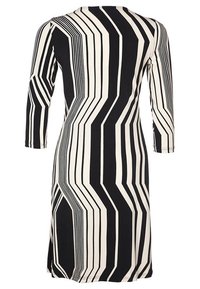 Robe avec un motif géométrique noir et blanc, décolleté en V, manches trois quarts, taille cintrée, finie par un ourlet rayé bleu.